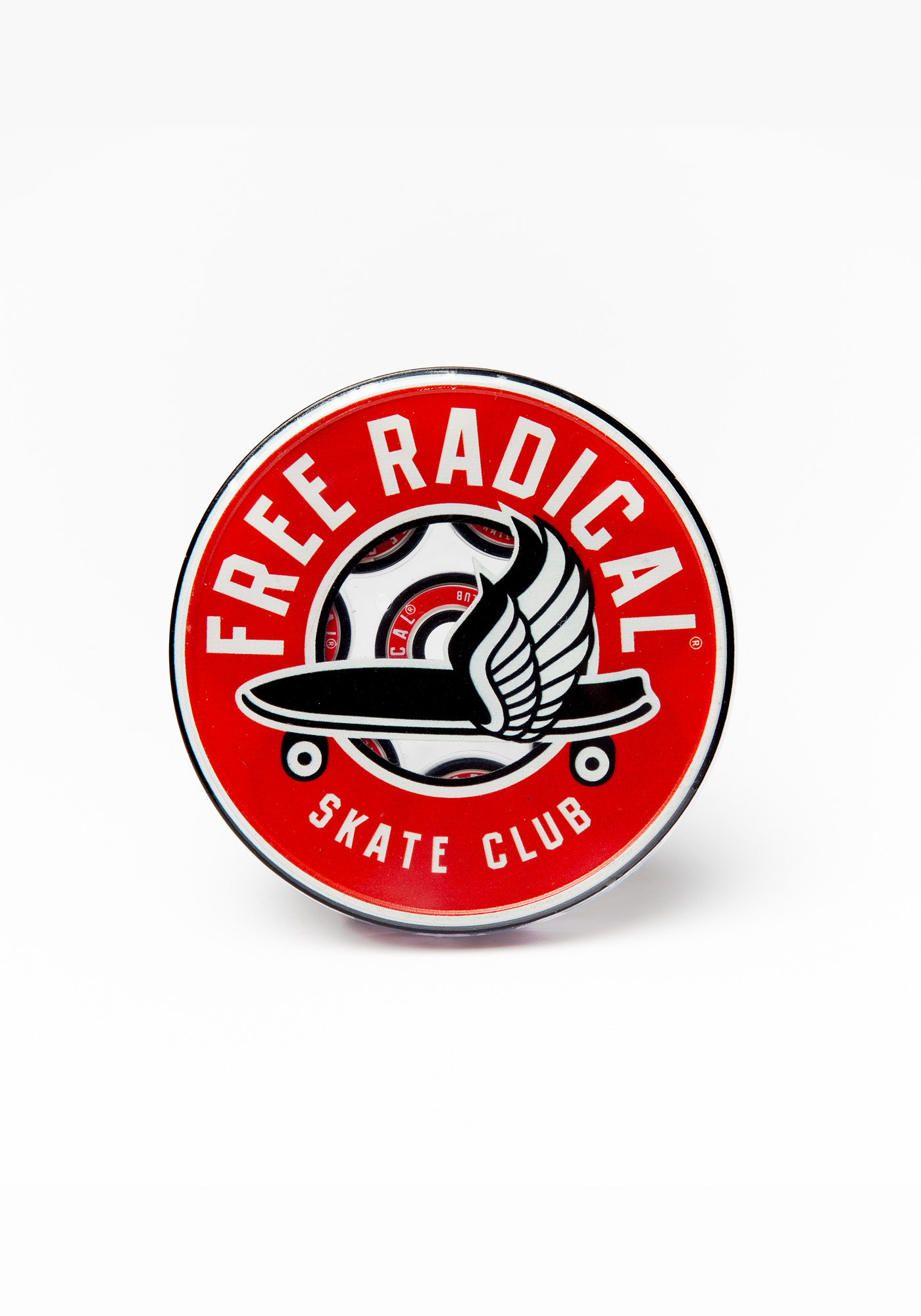 Red shield with white print